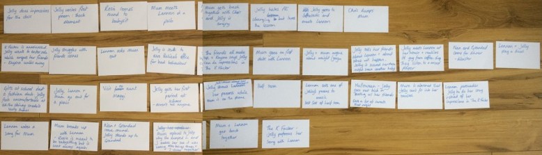 In order to restructure the first half of the book, I made notes on the key scenes I already had and laid them out on the floor. The structure wasn’t bad as such, but it wasn’t as strong as it could be – so I started again.