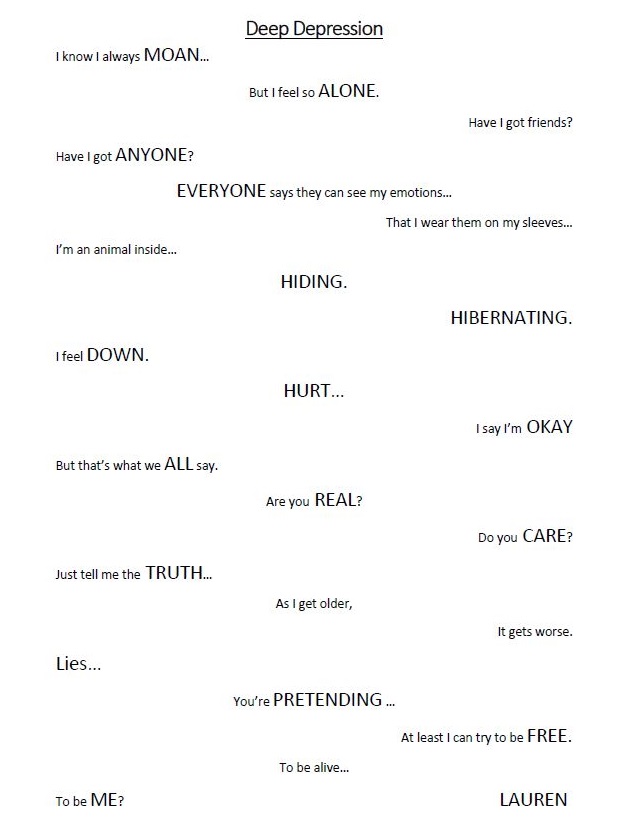 These poems are from students at North Oxfordshire Academy and were written after listening to the song ‘Happy Face’. Amazing work, girls, thank you! Click on any of the images to make them bigger.